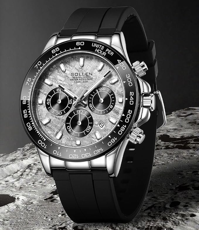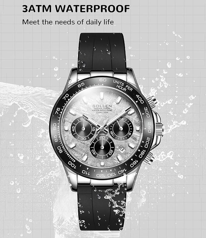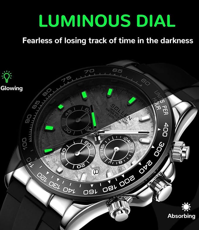 • High-Quality Manufacturing: SOLLEN multifunctional men’s wrist watches use quality quartz movement, aim to precision and accuracy. Mineral reinforced glass offers durability against daily wear and bumps, maintaining clarity of the wrist watch face. The rubber band provide comfort and softness for prolonged wear.